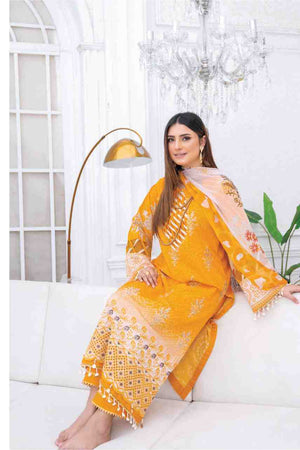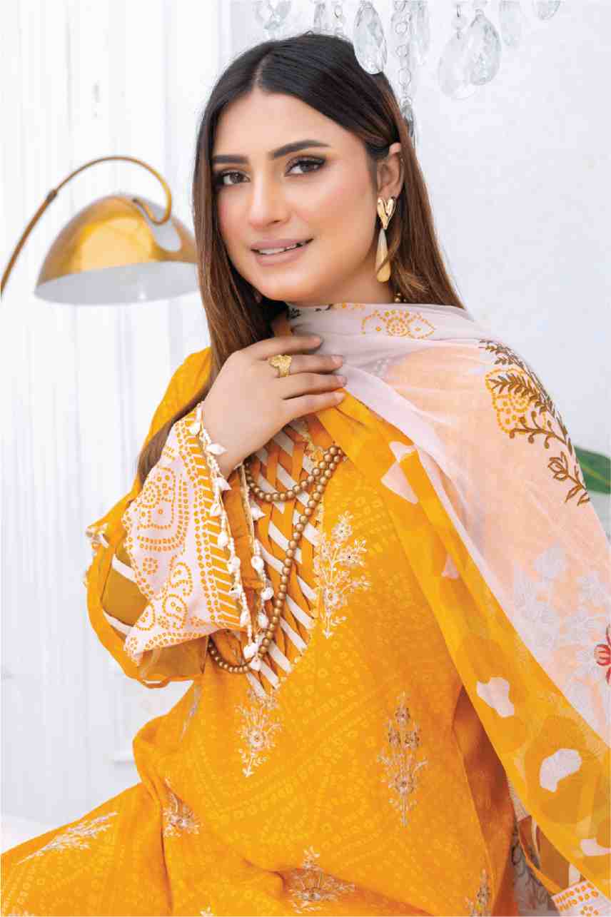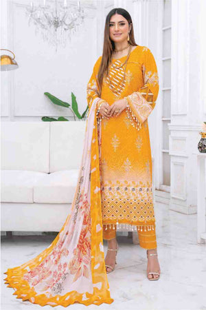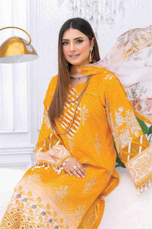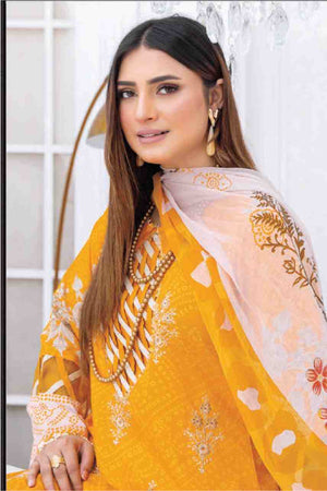 Dupatta: Lightweight Floral Print Chiffon Dupatta. Showcases a soft floral pattern with Yellow and Pink accents and a matching border.