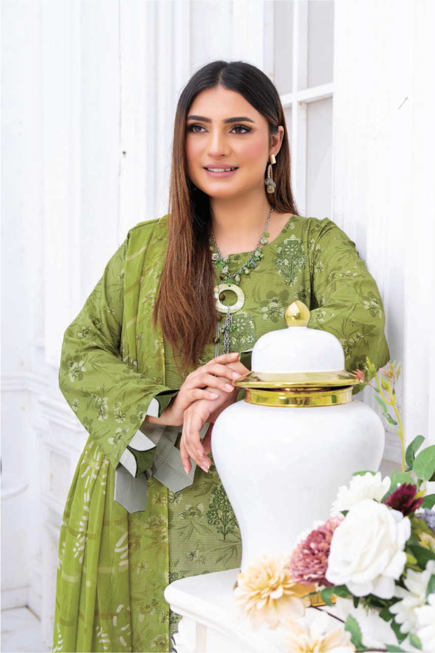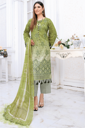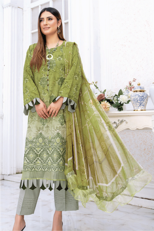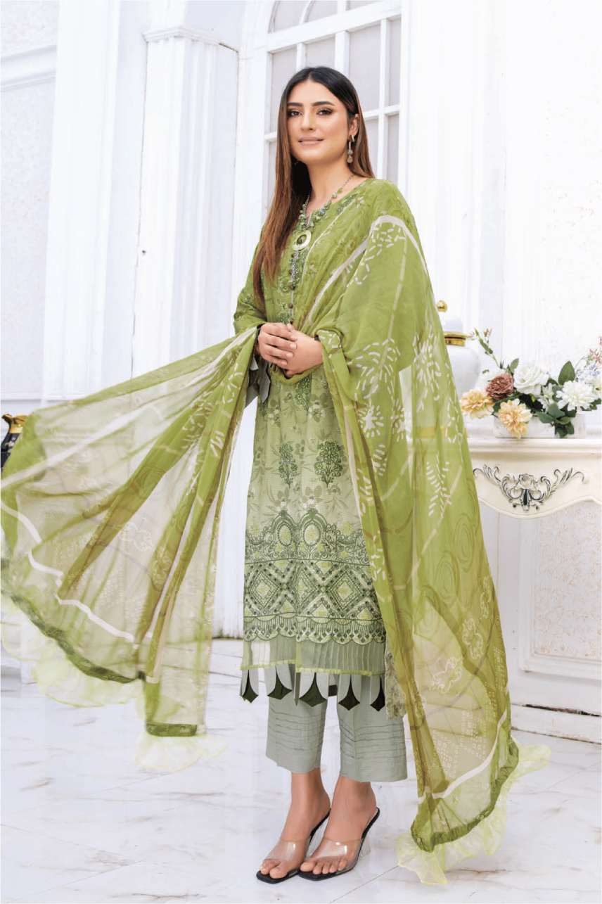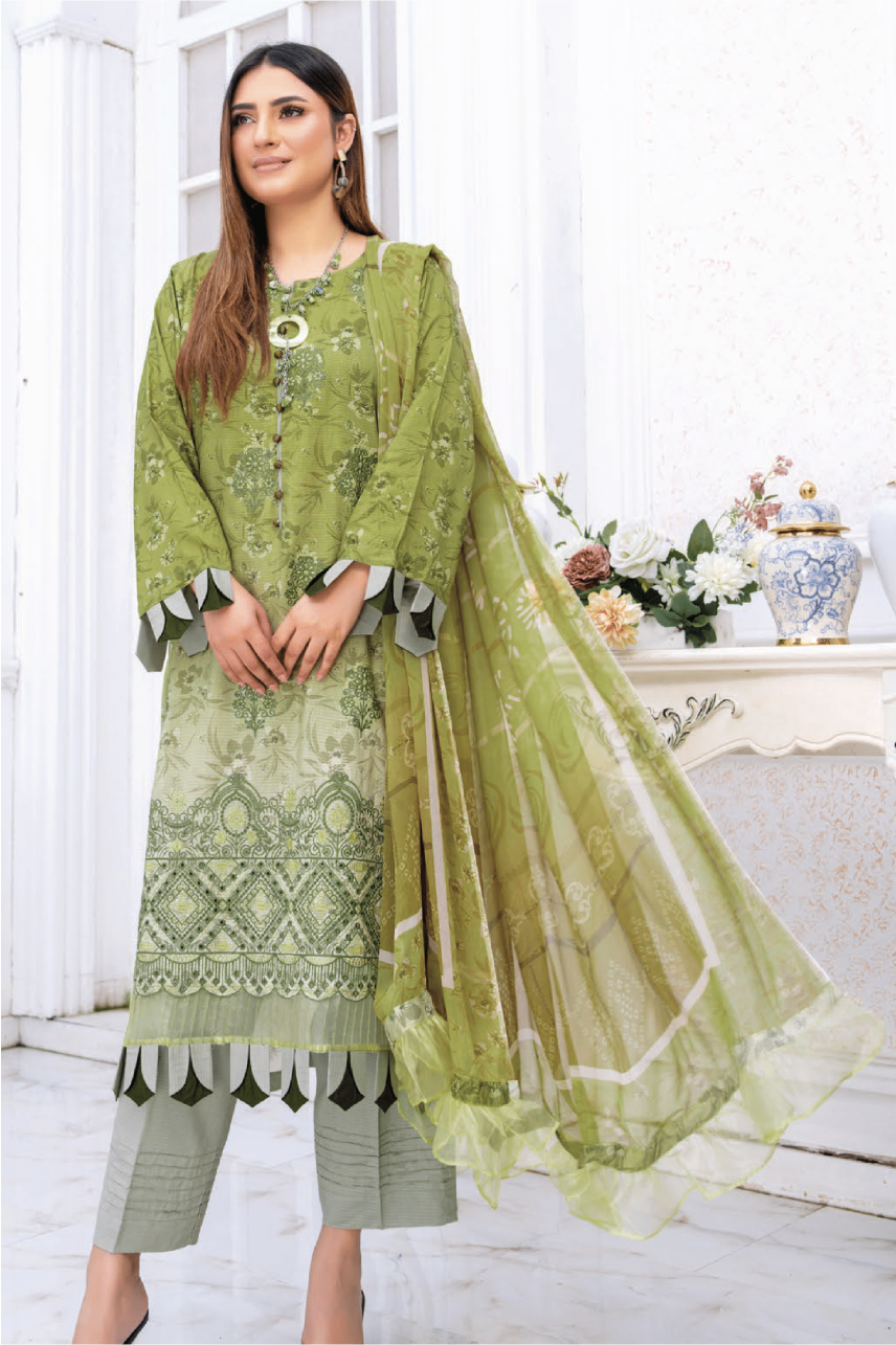 Dupatta: Lightweight Embroidered Chiffon Dupatta. Showcases a delicate printed pattern with frill/lace finishing on the border.