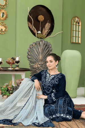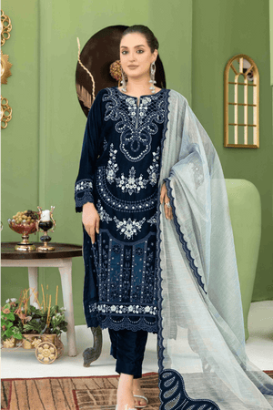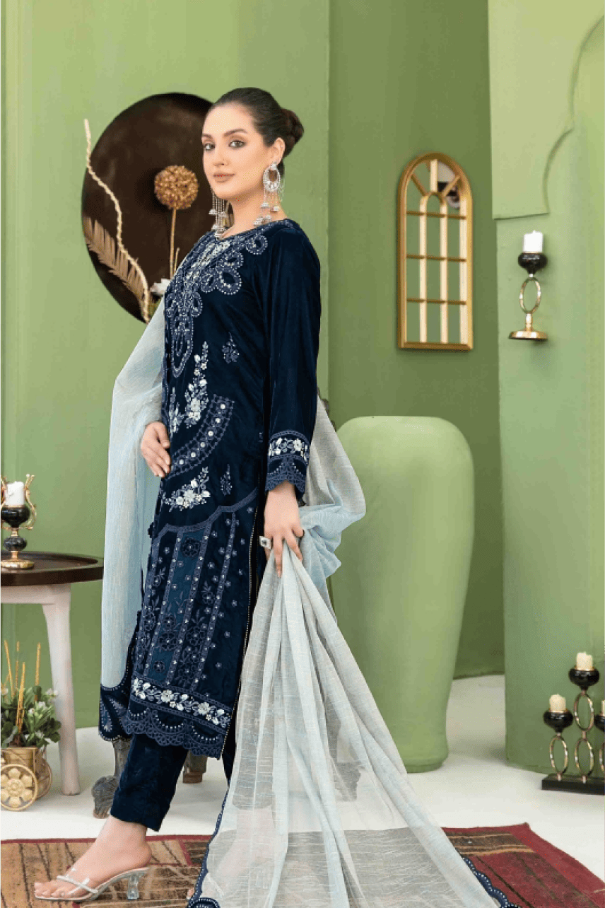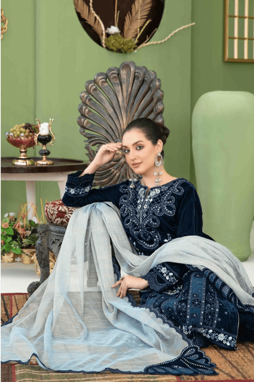 3 Piece Un-Stitched Collection By Tawakkal Fabrics, Attractive & Elegant Velvet Collection comes with: