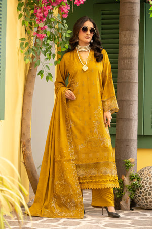 A rich and elegant unstitched 3-piece outfit crafted from premium Dhanak Karandi fabric, designed for winter and festive wear. Featuring detailed embroidery on the shirt and sleeves with a fancy embroidered shawl dupatta, this suit creates a graceful and polished look for special occasions.