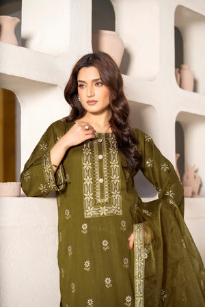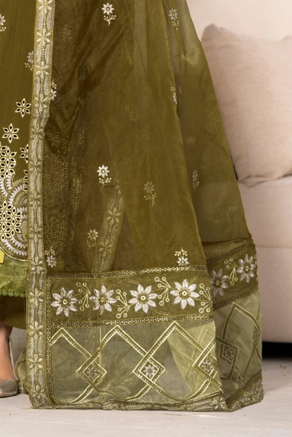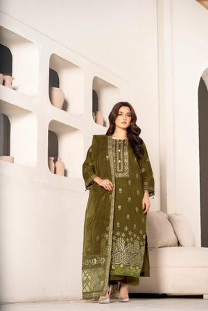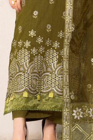 A fresh and elegant summer unstitched 3-piece suit in a deep olive green shade with matching organza dupatta and delicate tonal embroidery, crafted from exclusive cross slub lawn, featuring detailed embroidery and a fancy organza dupatta. Designed for Eid, summer gatherings, and semi-formal wear, this outfit offers breathable comfort with a refined festive look.