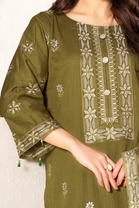 Olive Green - Premium Embroidered 3-Piece Suit Summer Unstitched Cross Slub Lawn
