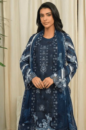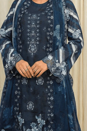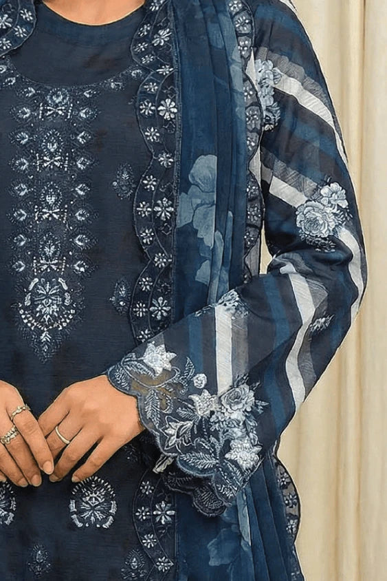 A graceful 3-piece outfit in rich navy blue, crafted from premium Bana Dora lawn.