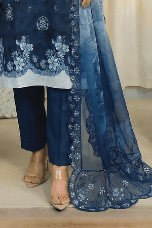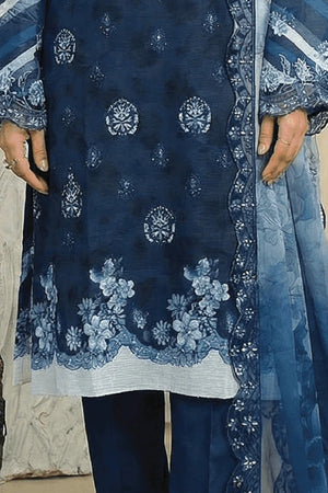 Paired with a matching deep blue fancy chiffon dupatta with four-side patti pallu embroidery. Perfect for summer, Eid, festive gatherings, and semi-formal occasions, offering breathable elegance