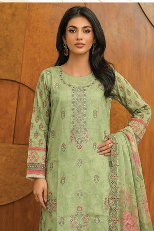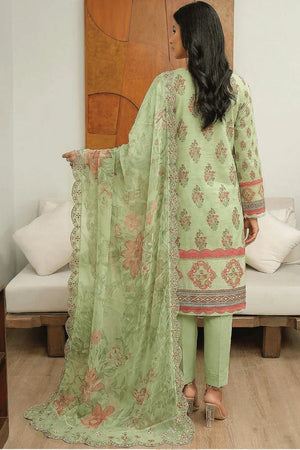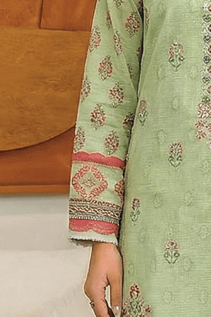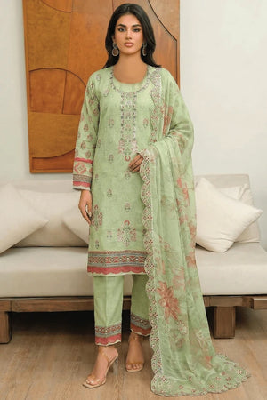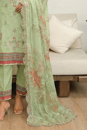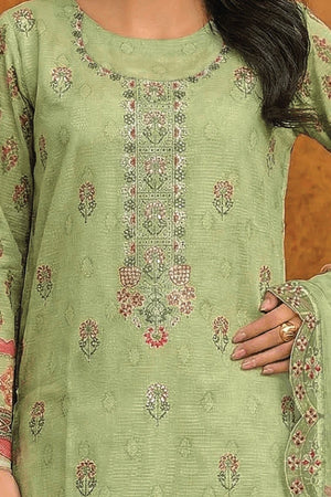A graceful 3-piece outfit in pastel mint-green, crafted from premium Bana Dora lawn.