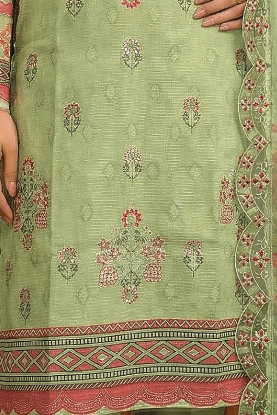 Paired with a matching light green chiffon dupatta with subtle pink floral details and 4-side Patti Pallu embroidery. Perfect for summer, Eid, festive gatherings, and semi-formal occasions, offering breathable elegance.