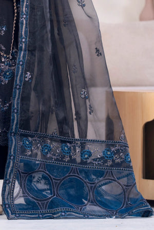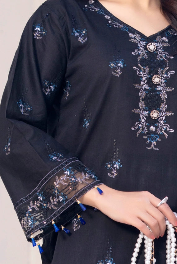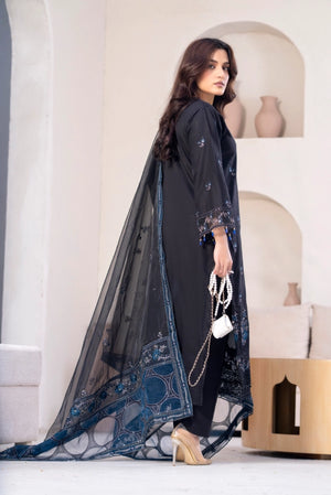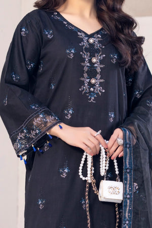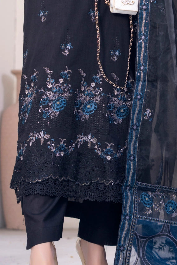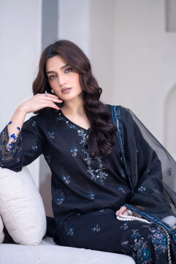 A fresh and elegant summer unstitched 3-piece suit crafted from exclusive cross slub lawn in a deep black shade, featuring teal-blue and silver embroidery and a matching black fancy organza dupatta with teal accents. Designed for Eid, summer gatherings, and semi-formal wear, this outfit offers breathable comfort with a refined festive look.