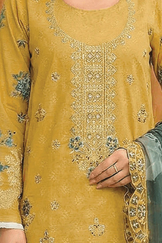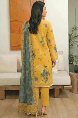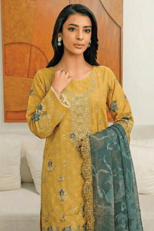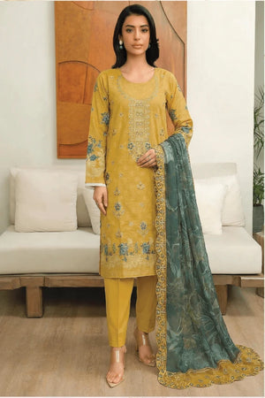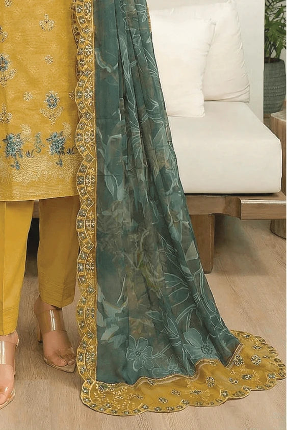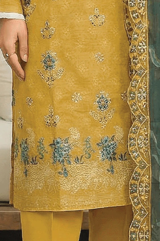A graceful 3-piece outfit in rich mustard-gold, crafted from premium Bana Dora lawn.