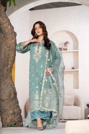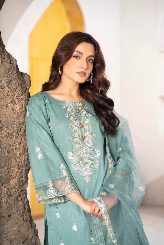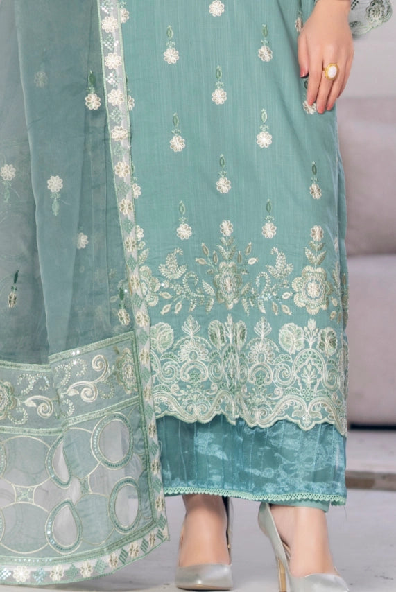 A fresh and elegant summer unstitched 3-piece suit crafted from exclusive cross slub lawn in a soft sea-green hue, featuring detailed white/silver embroidery and a matching sheer sea-green fancy organza dupatta. Designed for Eid, summer gatherings, and semi-formal wear, this outfit offers breathable comfort with a refined festive look.