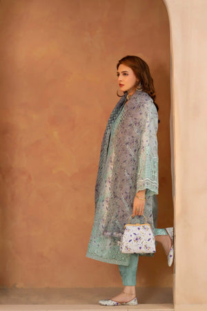 A luxurious semi-stitched 3-piece outfit crafted from premium organza fabric, designed for festive and formal occasions. Featuring exclusive embroidery on the shirt and a printed & embroidered fancy dupatta, paired with digital printed silk inner, this suit comes with complimentary clutches & khussa for a complete elegant look.