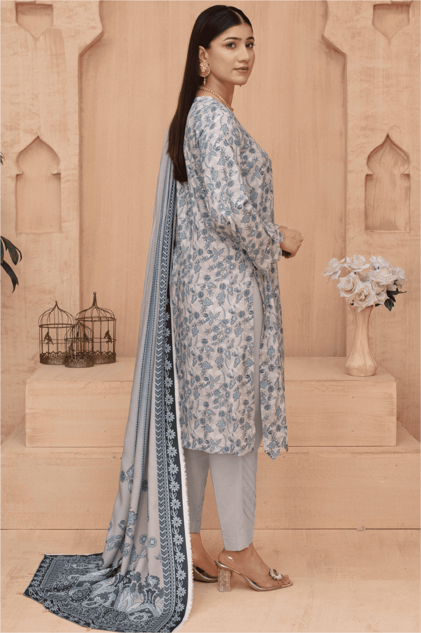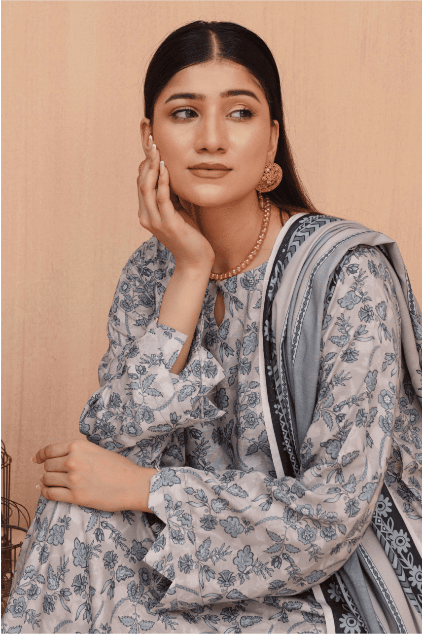 Shirt: Elegance Digital Print Lawn with Intricate Embroidery on the front, daman (hem), back, and sleeves in a soothing grey-blue floral pattern.