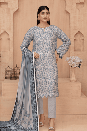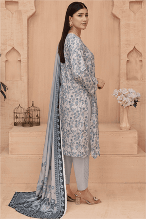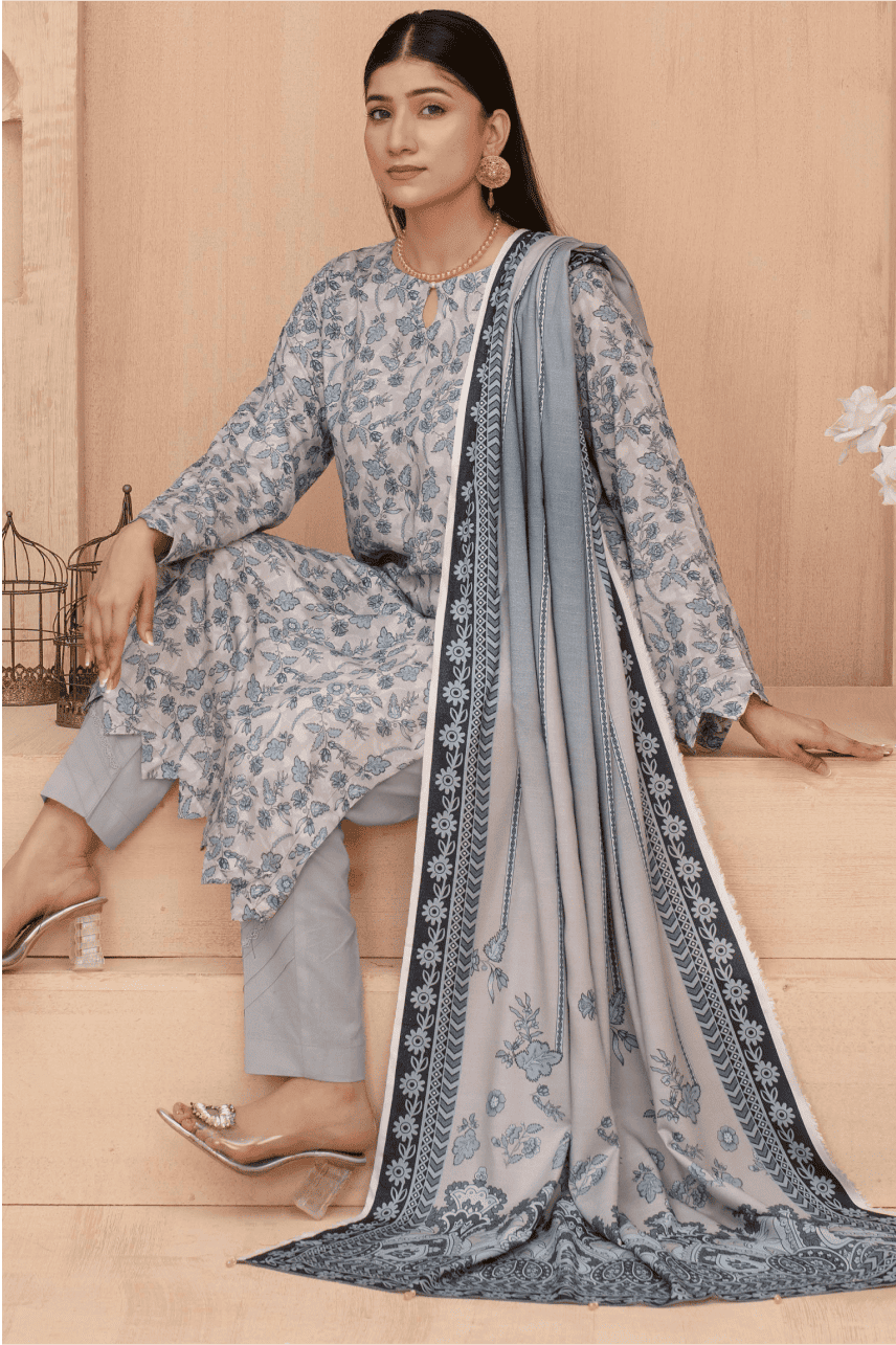 Dupatta: Flowing Digital Print Silk/Luxury Lawn in coordinating grey-blue shades with a detailed, embroidered border.