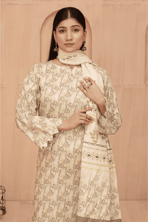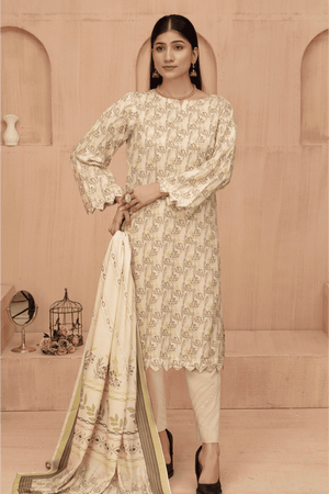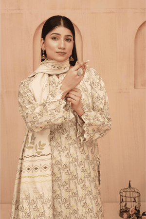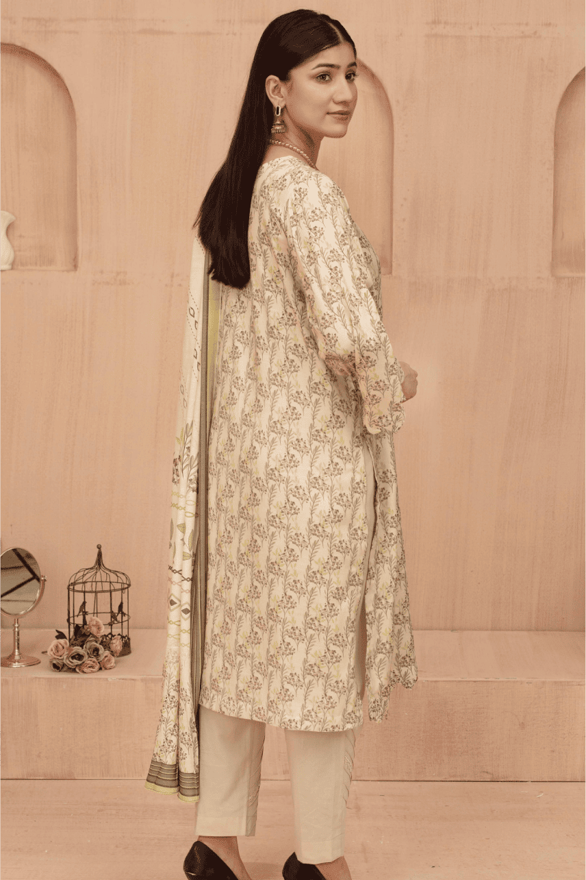 Shirt: Elegance Digital Print Lawn with Intricate Embroidery on the front, daman (hem), back, and sleeves in a gentle ivory-yellow base with subtle olive green patterns.