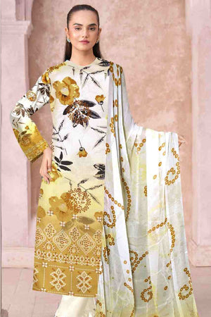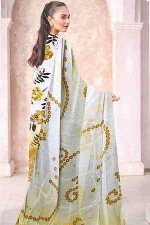 Dupatta: Lightweight Digital Print Dupatta. Showcases a contrasting Bandhani style motif with a deep mustard-gold border print.