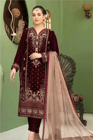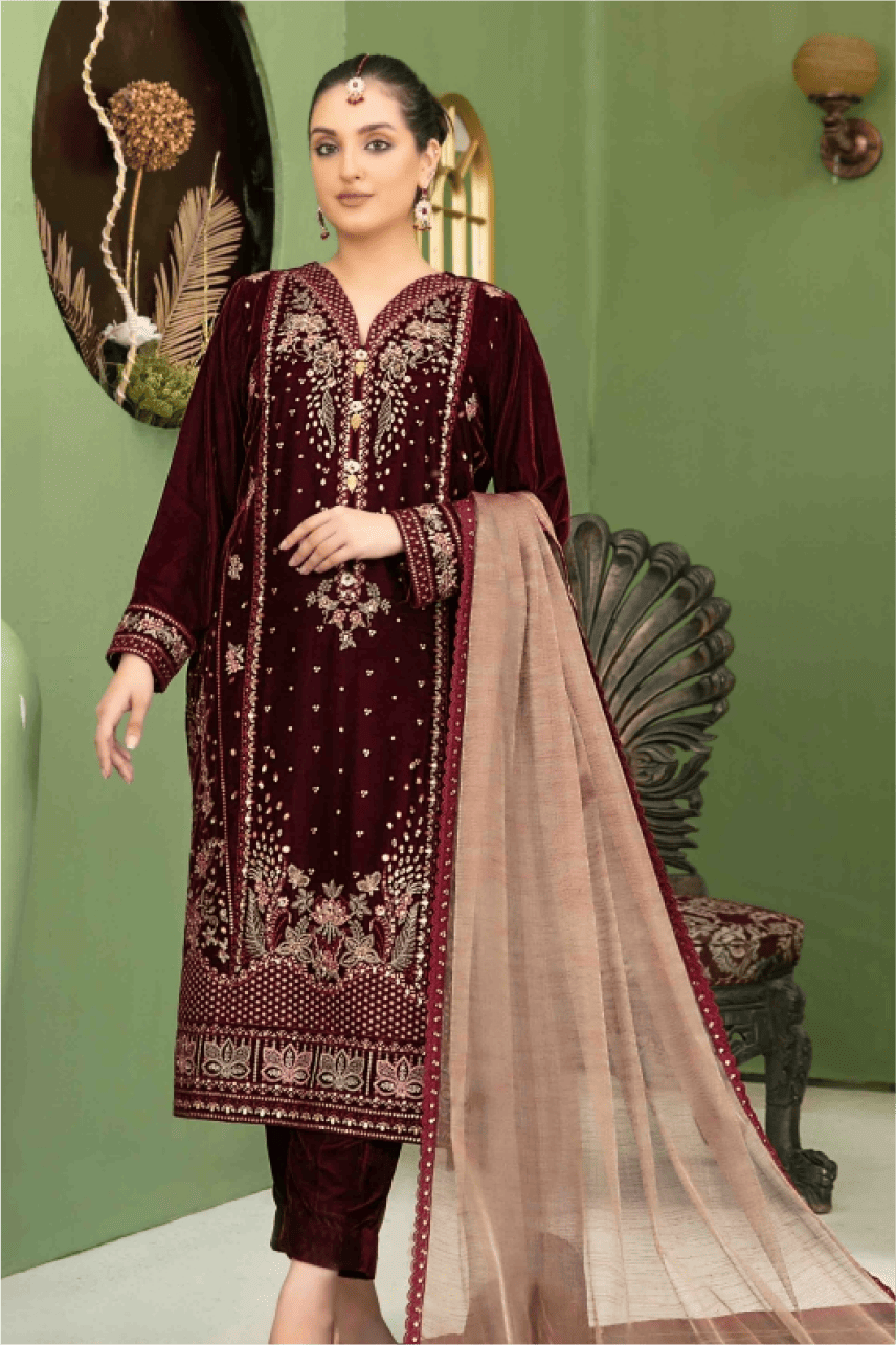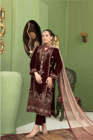 3 Piece Un-Stitched Collection By Tawakkal Fabrics, Attractive & Elegant Velvet Collection comes with: