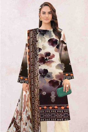 Shirt: Premium Digital Print Linen shirt. Features an elegant shaded watercolor floral print with striking rust-brown and dark geometric borders on the daman, back, and sleeves.