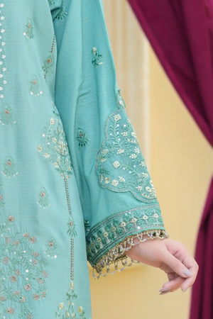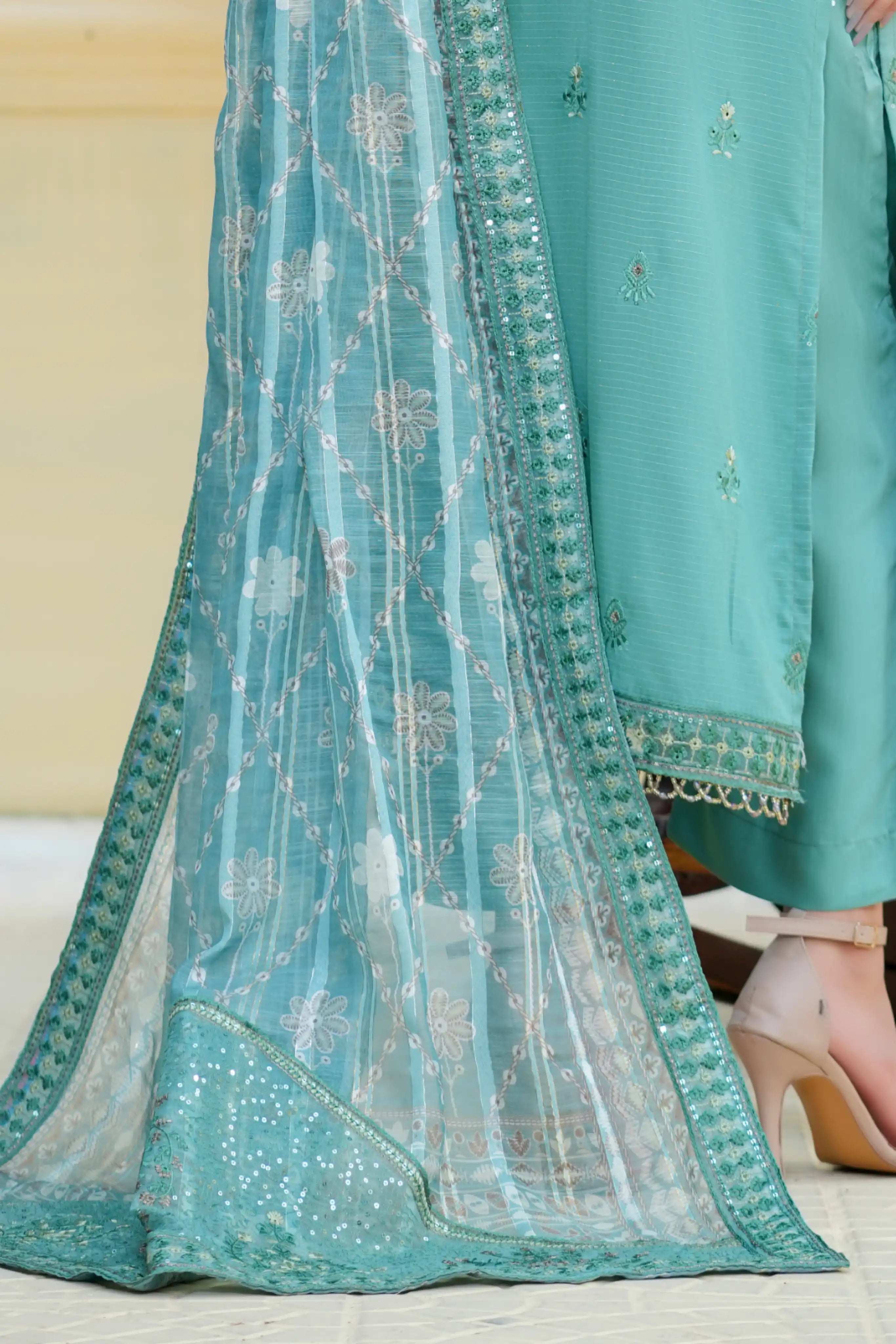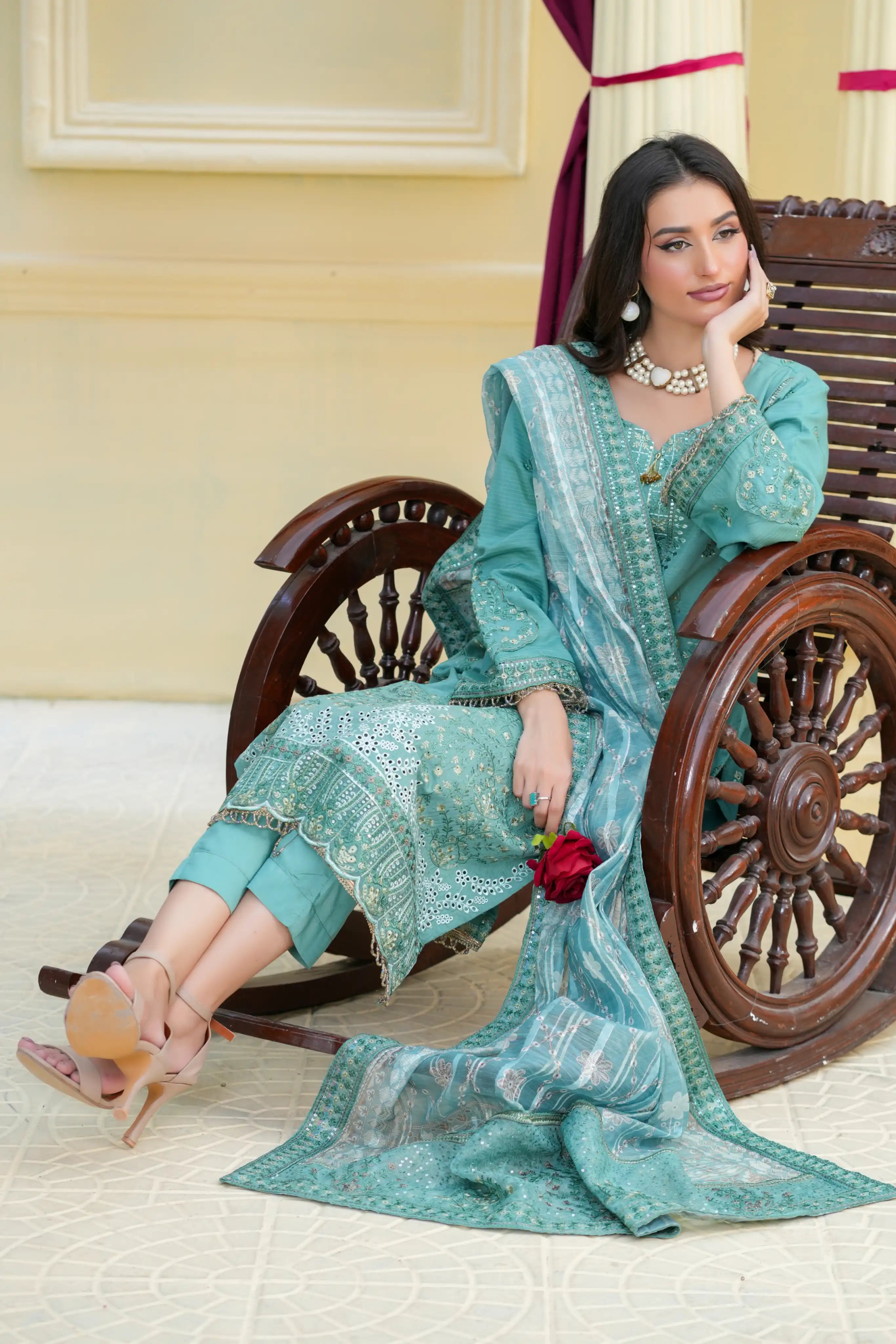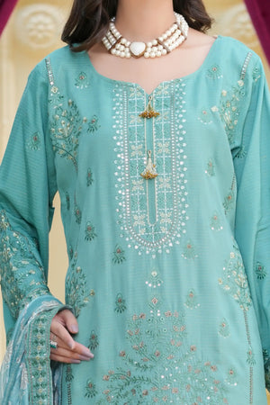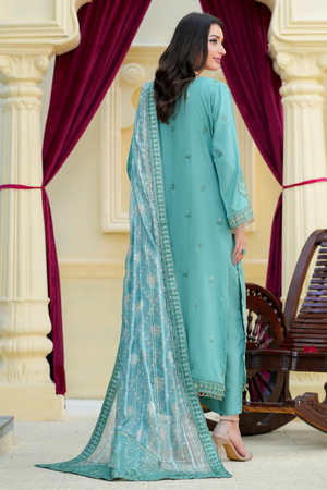 An elegant unstitched 3-piece outfit crafted from Chamki Bana Dora viscose, designed for festive and semi-formal wear. Featuring exclusive embroidery on the shirt and back along with a printed & embroidered fancy dupatta, this suit offers a sophisticated and stylish look.