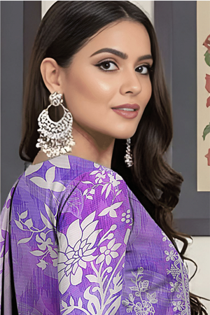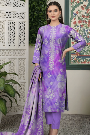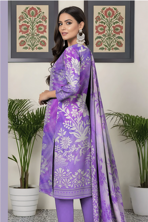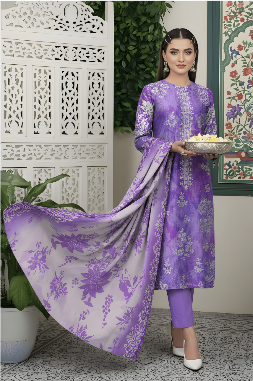 Dupatta: Flowing Digital Print Silk/Luxury Lawn in coordinating purple/lavender ombre style with a detailed, embroidered border.