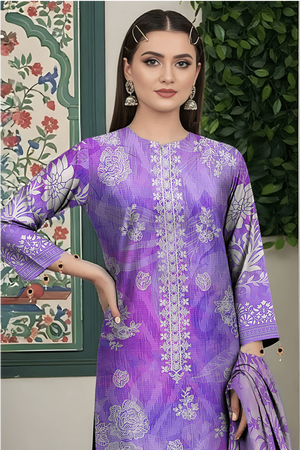Shirt: Elegance Digital Print LInen with Intricate Embroidery on the front, daman (hem), back, and sleeves in a vibrant vivid-purple with soft lavender floral patterns.