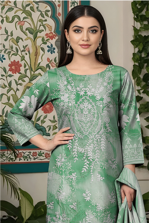 Dupatta: Flowing Digital Print Silk/Luxury Lawn in coordinating sage-green and light grey abstract designs with a detailed, embroidered border.