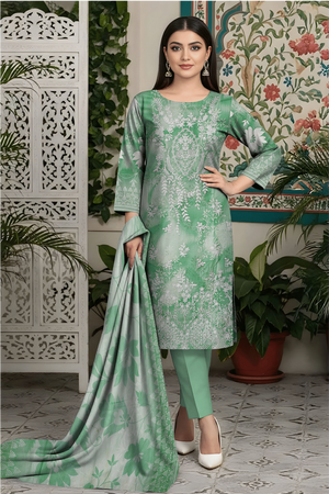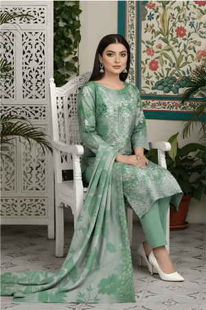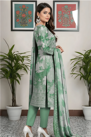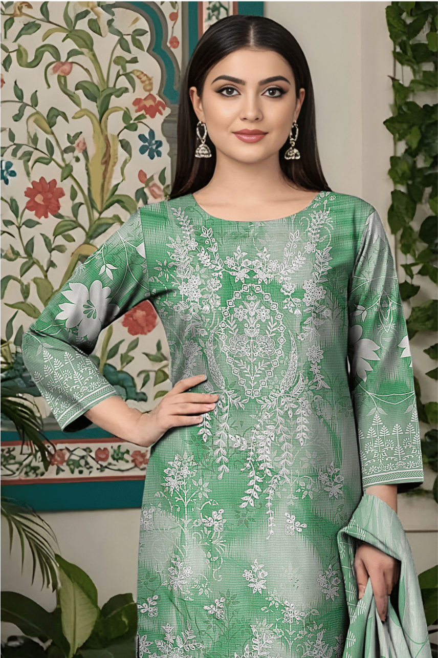 Shirt: Elegance Digital Print Linen with Intricate Embroidery on the front, daman (hem), back, and sleeves in a serene sage-green base with delicate lighter green floral patterns.