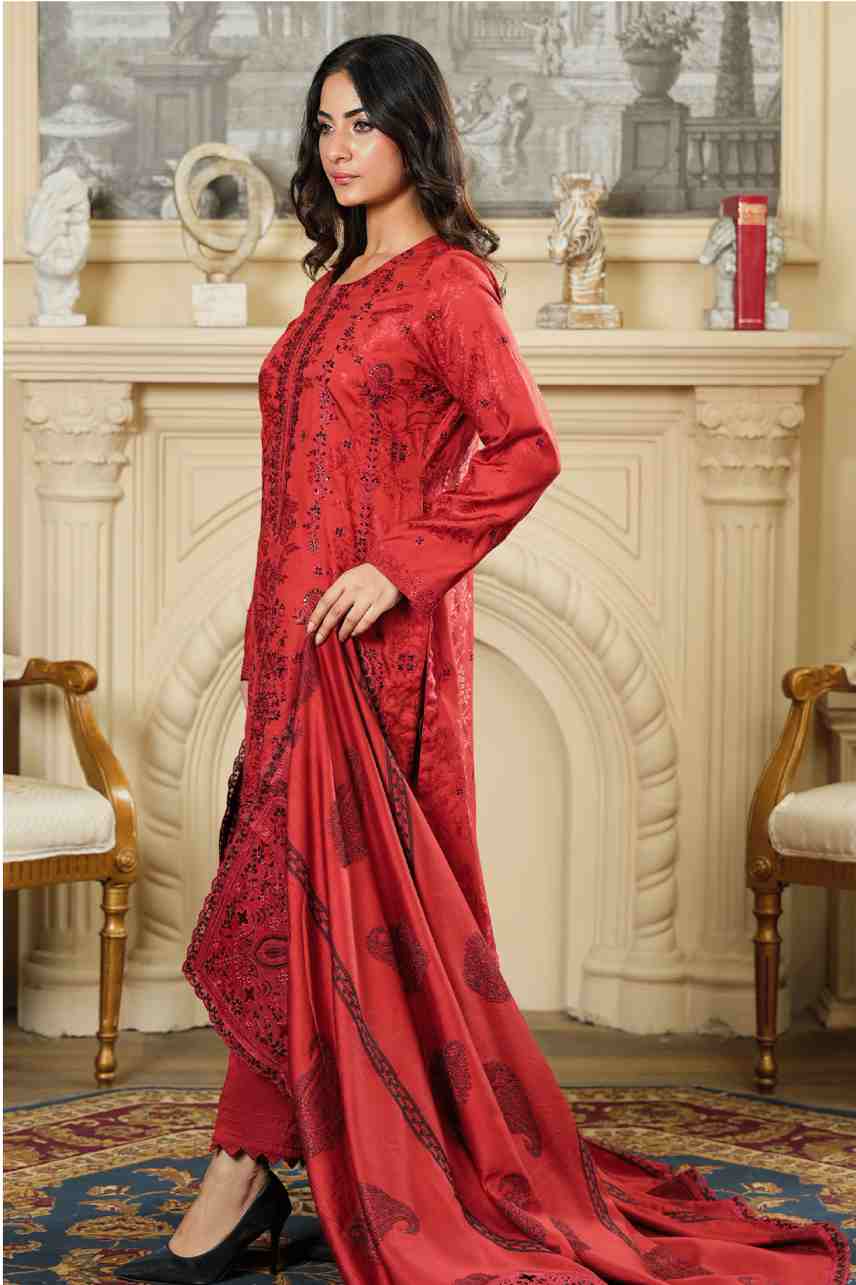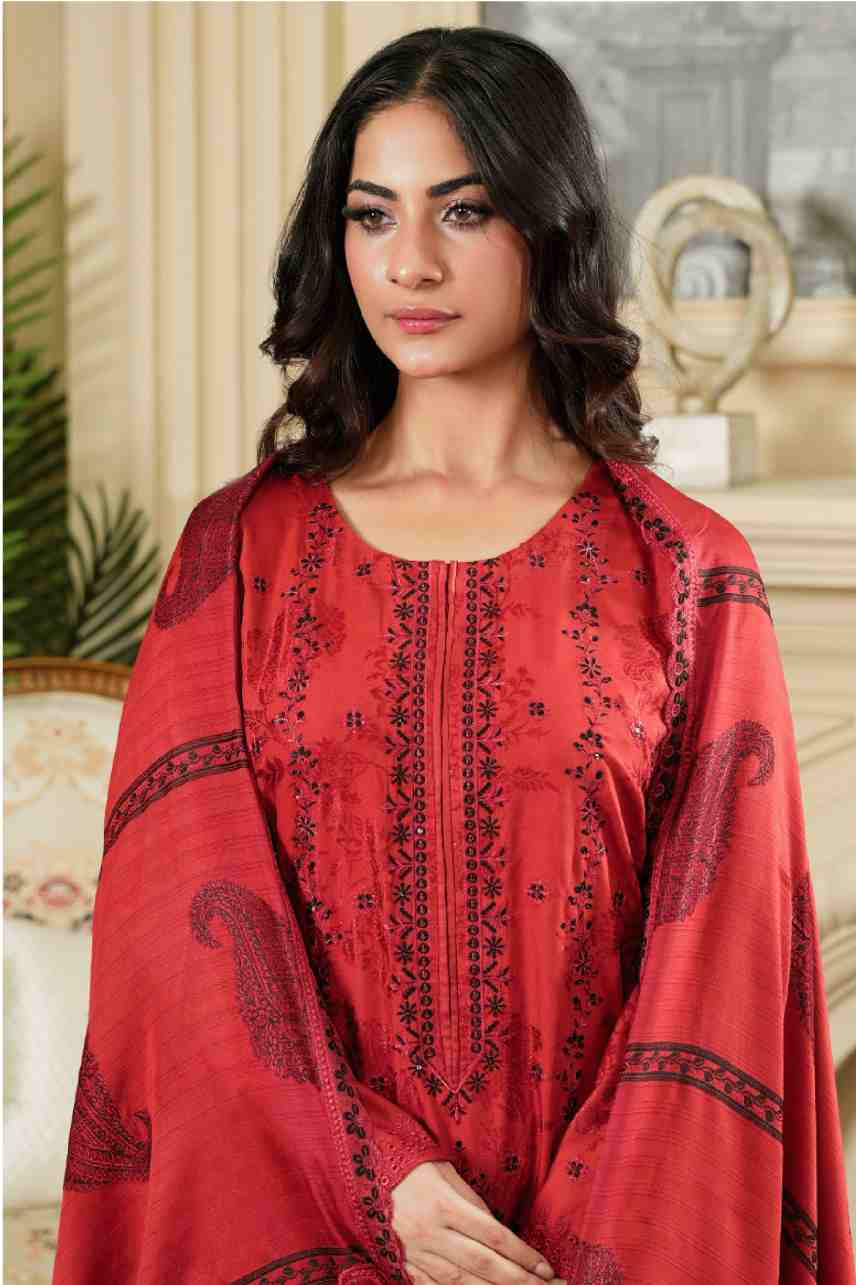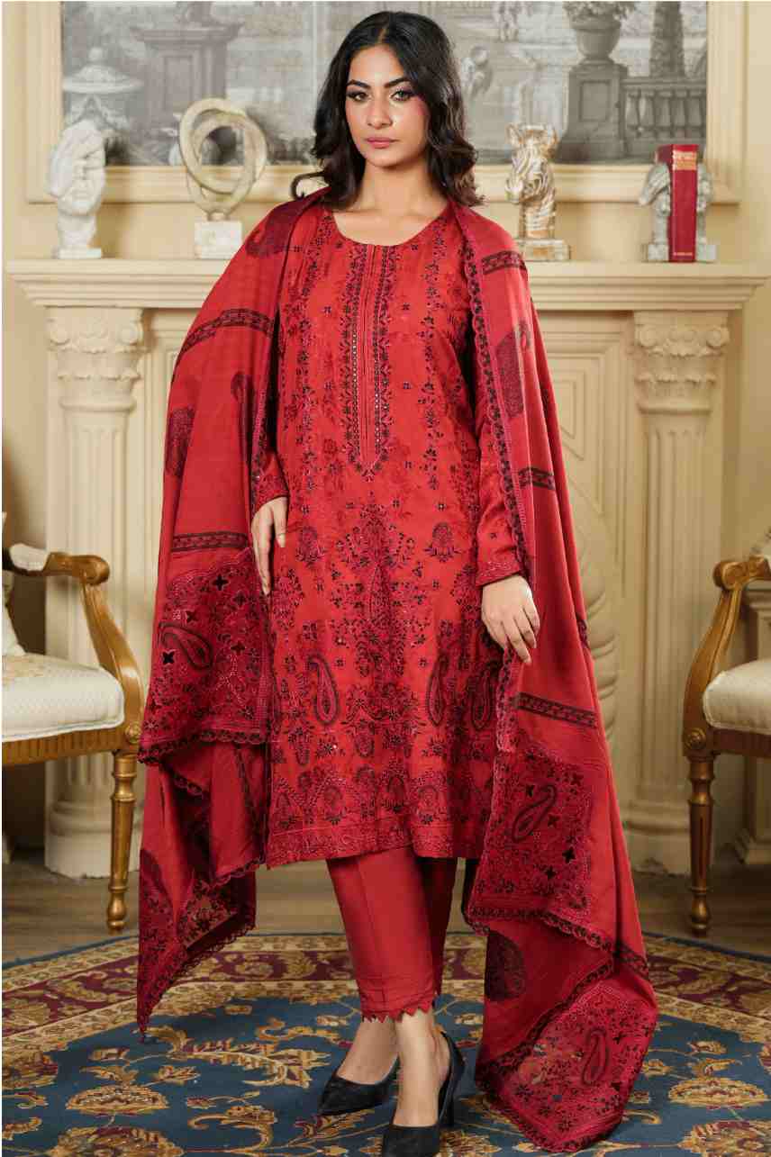 Shirt: Premium Khaddar Fabric with Rich Monochromatic Embroidery and Elegant Paisley Motifs on the front and sleeves. Features a Detailed Embroidered Neckline.