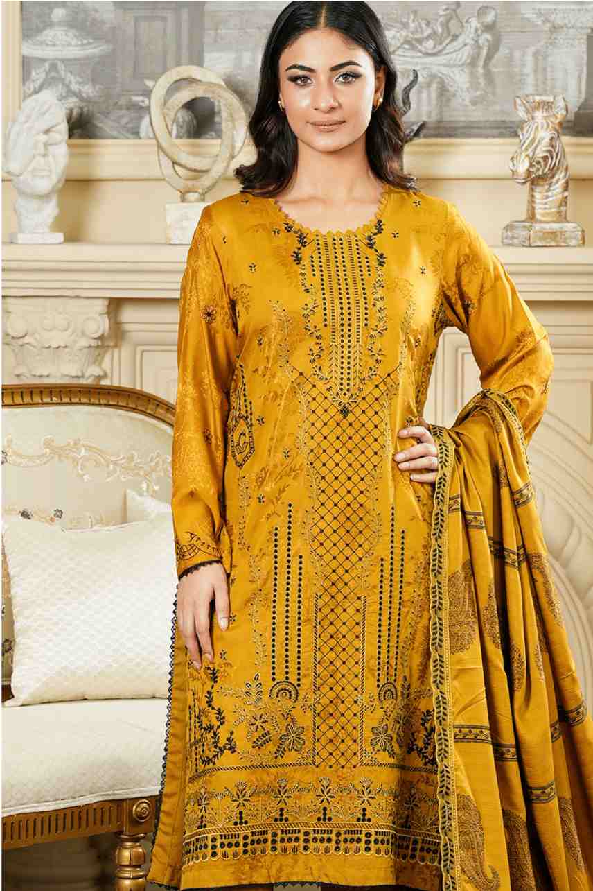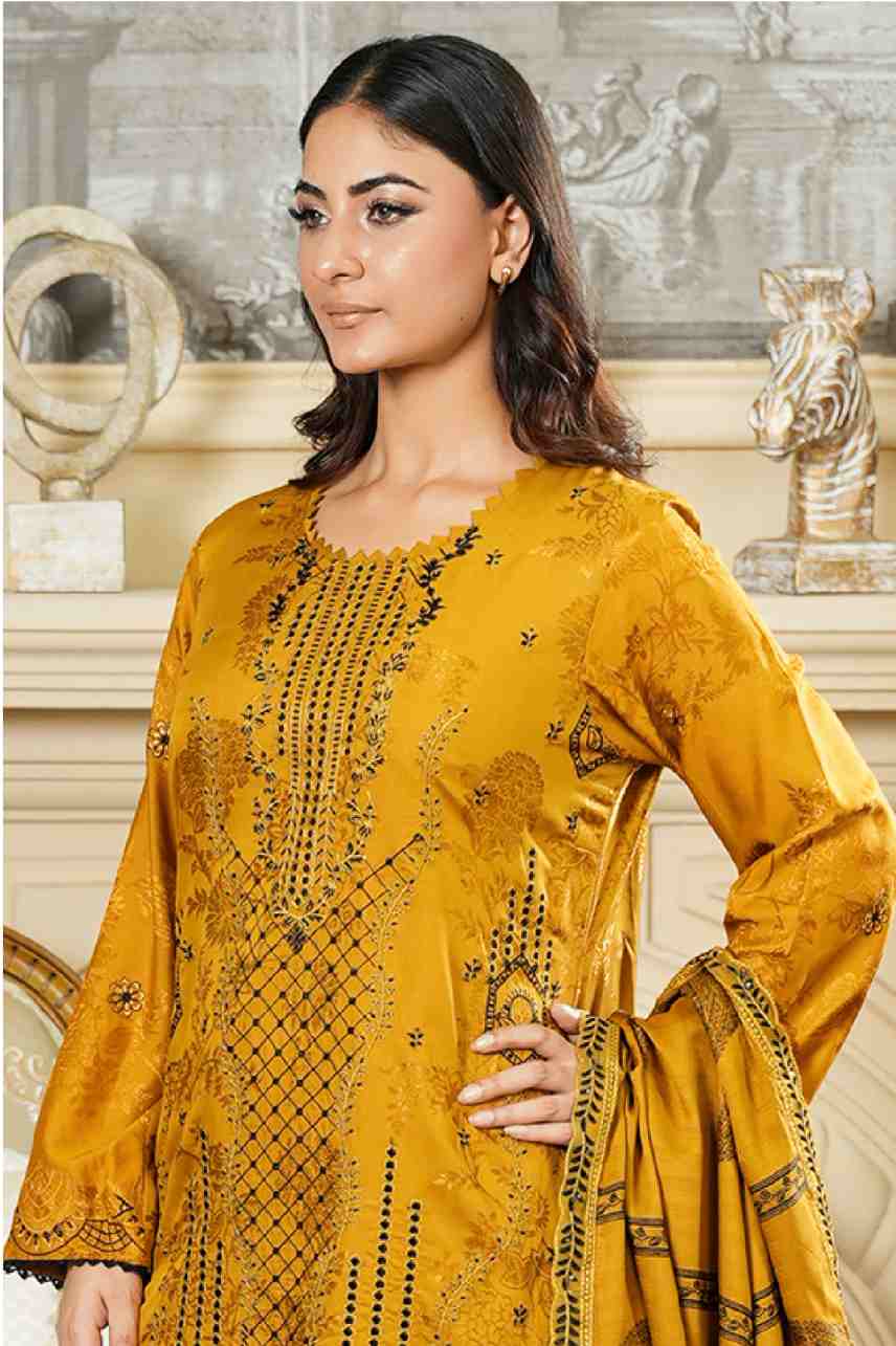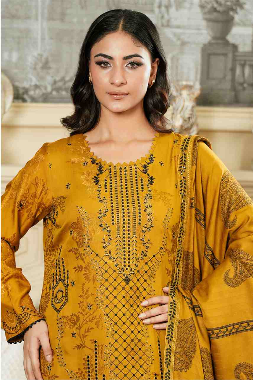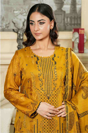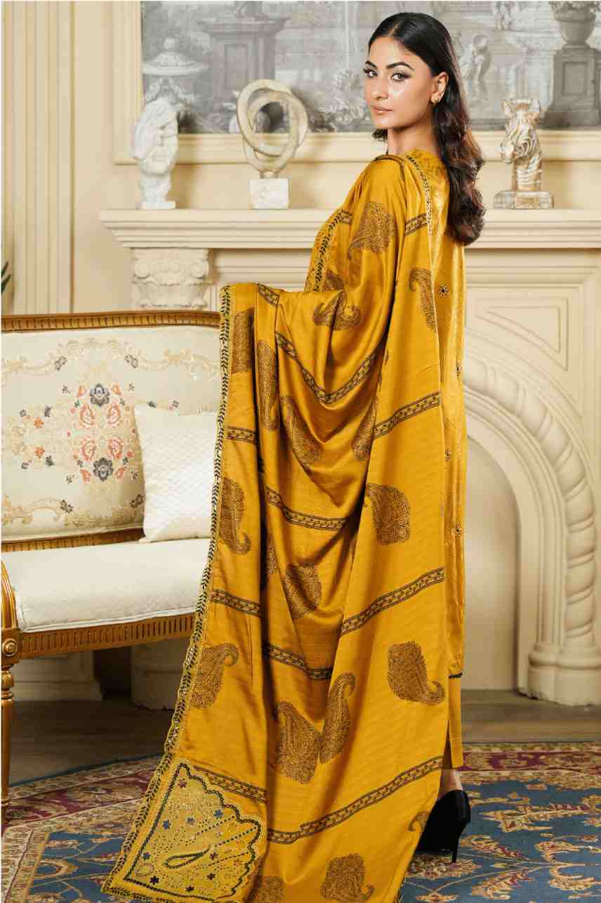 Shirt: Premium Khaddar Fabric with Elegant Self-Print and Intricate Black Embroidery on the front. Features a Detailed Embroidered Neckline and Matching Printed Cuffs on the sleeves.