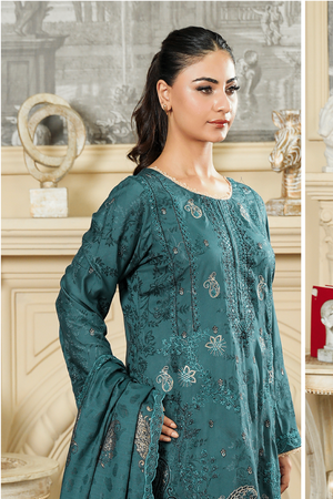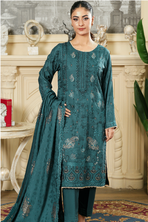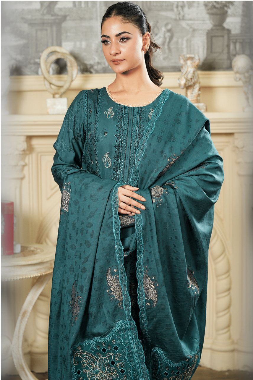 Shirt: Premium Khaddar Fabric with Subtle Self-Prints and Intricate Embroidery on the front and sleeves. Features a Round Neckline and Paisley Motifs on the daman.